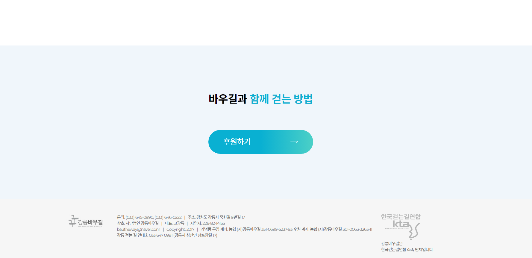 - 문의. (033) 645-0990, (033) 646-0222 | 주소. 강원도 강릉시 죽헌길 9번길 17bautheway@naver.com | Copyright. 2017 | 기념품 구입 계좌, 농협 (사)강릉바우길 351-0699-5237-93 후원 계좌, 농협 (사)강릉바우길 301-0063-3263-11